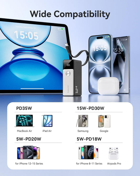 Cargador portátil Kuulaa 5000mAh con carga rápida 35W, cable integrado y enchufe de pared
