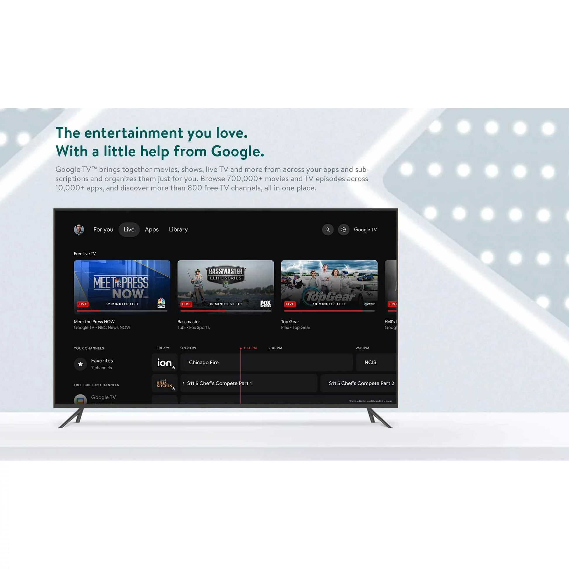 Google TV organiza todo tu entretenimiento en una sola pantalla, eliminando la necesidad de saltar de una app a otra. Recibe recomendaciones personalizadas y explora más de 800 canales gratuitos y 10,000+ apps. Configuración rápida con tu cuenta de Google y conectividad Wi-Fi rápida y estable.
