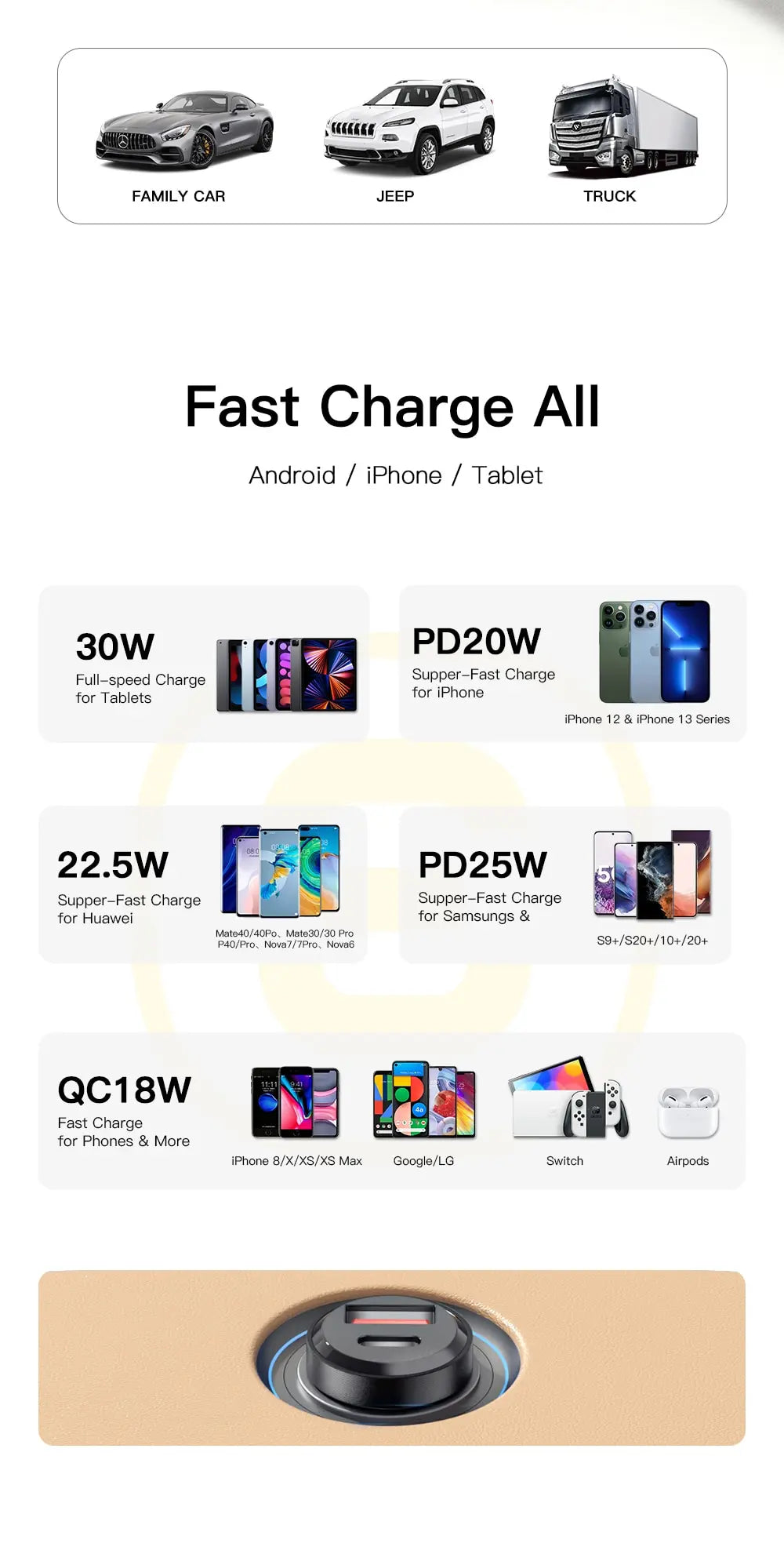 Compatible con una amplia gama de dispositivos, incluidos iPhone 12, 13, Huawei, Samsung y Xiaomi con puertos USB Tipo C, este cargador es perfecto para satisfacer todas tus necesidades de carga mientras estás en el coche. Además, con una potencia de salida máxima de 30W, puedes estar seguro de que tus dispositivos se cargarán rápidamente y de manera eficiente.
