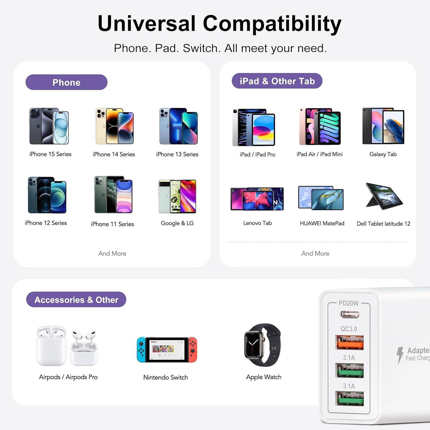 Descubre el Cargador USB-C and USB-A 20W PD Fast Charge 4 Port para cargar hasta 4 dispositivos simultáneamente con rapidez y eficiencia. Hasta 3 veces más rápido que un cargador de 5W, el cargador puede cargar el iPhone 13 al 50% en tan solo 30 minutos. Una solución ideal para tu estilo de vida ajetreado.